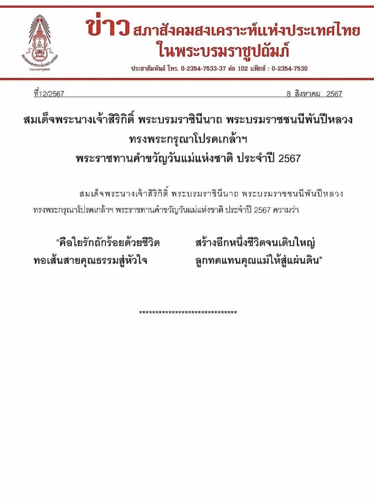 เนื่องในโอกาสมหามงคลเฉลิมพระชนมพรรษา สมเด็จพระบรมราชชนนีพันปีหลวง เจริญพระชนมพรรษา 91 พรรษา 12 สิงหาคม 2567 ข้าพระพุทธเจ้า ขอพระราชทานพระบรมราชวโรกาสถวายพระพรชัยมงคล ขอพระองค์ทรงพระเจริญ