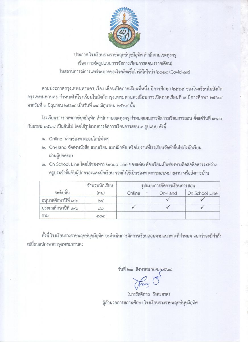 ประกาศโรงเรีนรางราชพฤกษ์นุชมีอุทิศ เรื่องการจัดรูปแบบการจัดการเรียนการสอน(รายเดือน) ในสถานการ์กากรแพร่ระบาดของโรคติดเชื่อไวรัสโคดรน่า 2019