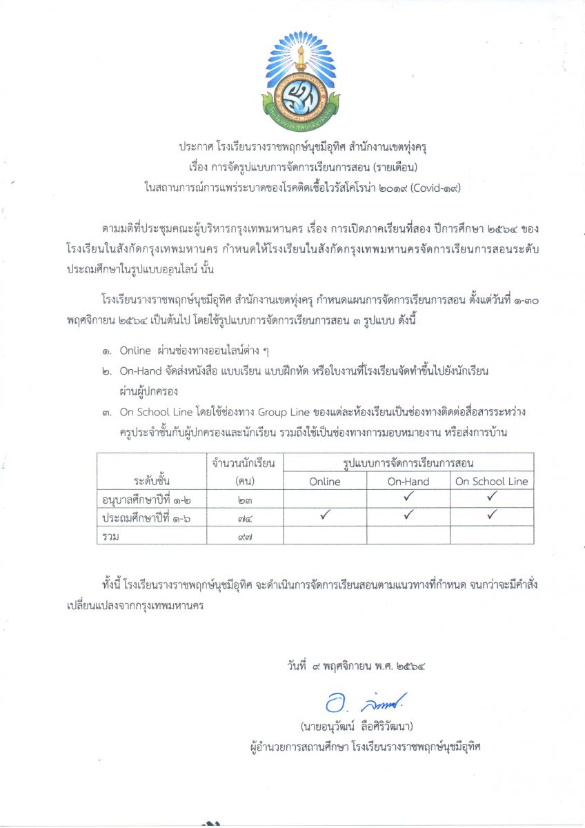 ประกาศ โรงเรียนรางราชพฤกษ์นุชมีอุทิศ สำนักงานเขตทุ่งครุ เรื่อง การจัดรูปแบบการจัดการเรียนการสอน(รายเดือน) ในสถานการณ์การแพร่ระบาดของโดรคระบาดติดเชื้อไวรัสโคโรน่า 2019 (Covid-19)