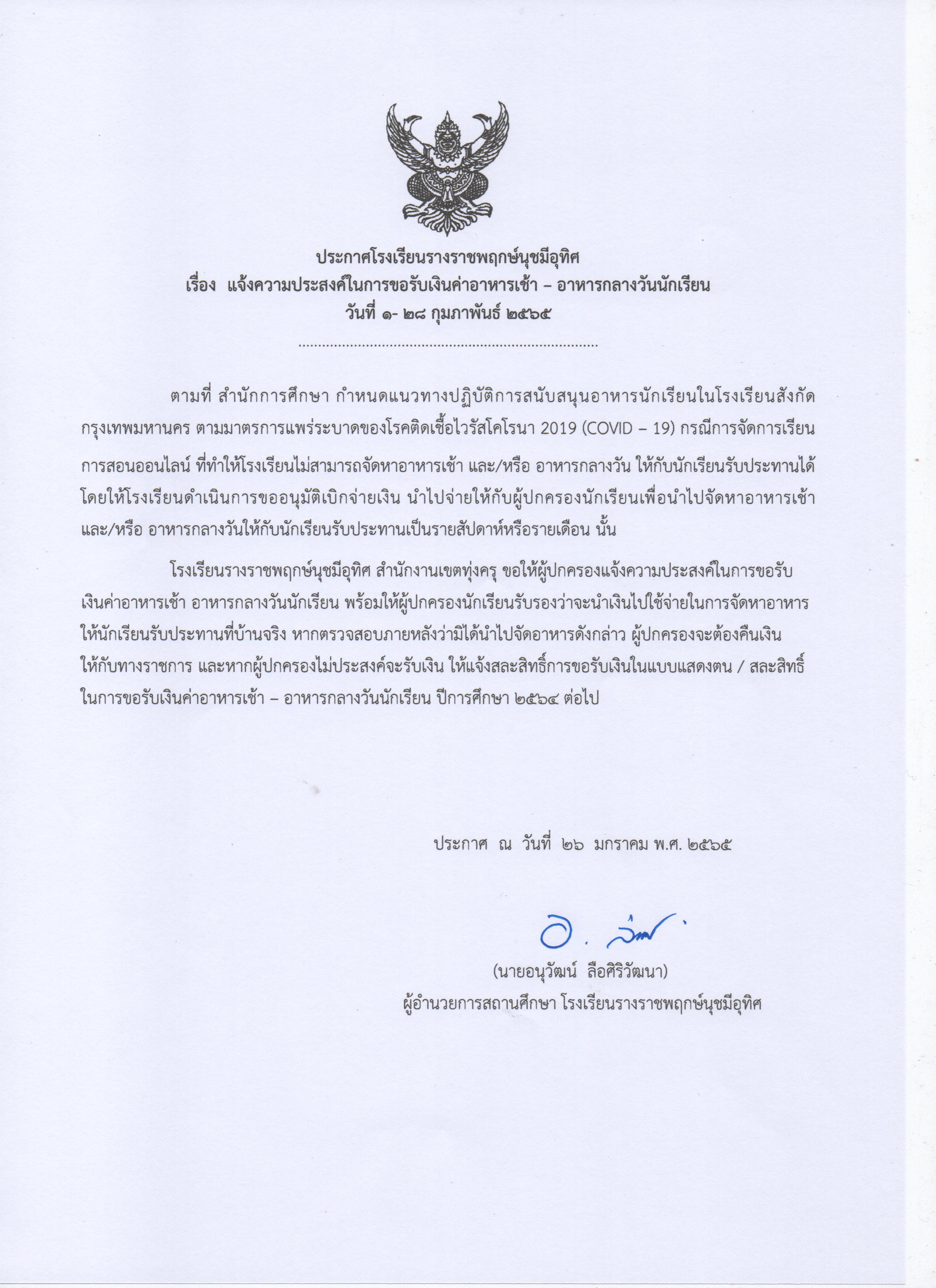 ประกาศ แจ้งความประสงค์ในการขอรับอาหารเช้า-กลางวัน นักเรียน วันที่ 1-28 กุมภาพันธ์ 2565