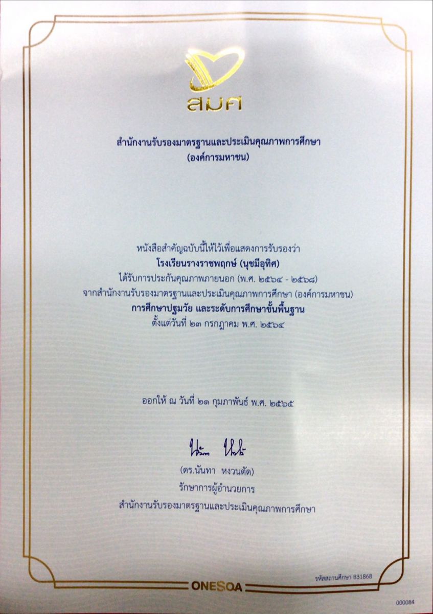 โรงเรียนรางราชพฤกษ์นุชมีอุทิศ ได้รับการประกันคุณภาพภายนอก จากสำนักงานคณะกรรมการและประเมินคุณภาพการศึกษา (องค์การมหาชน)