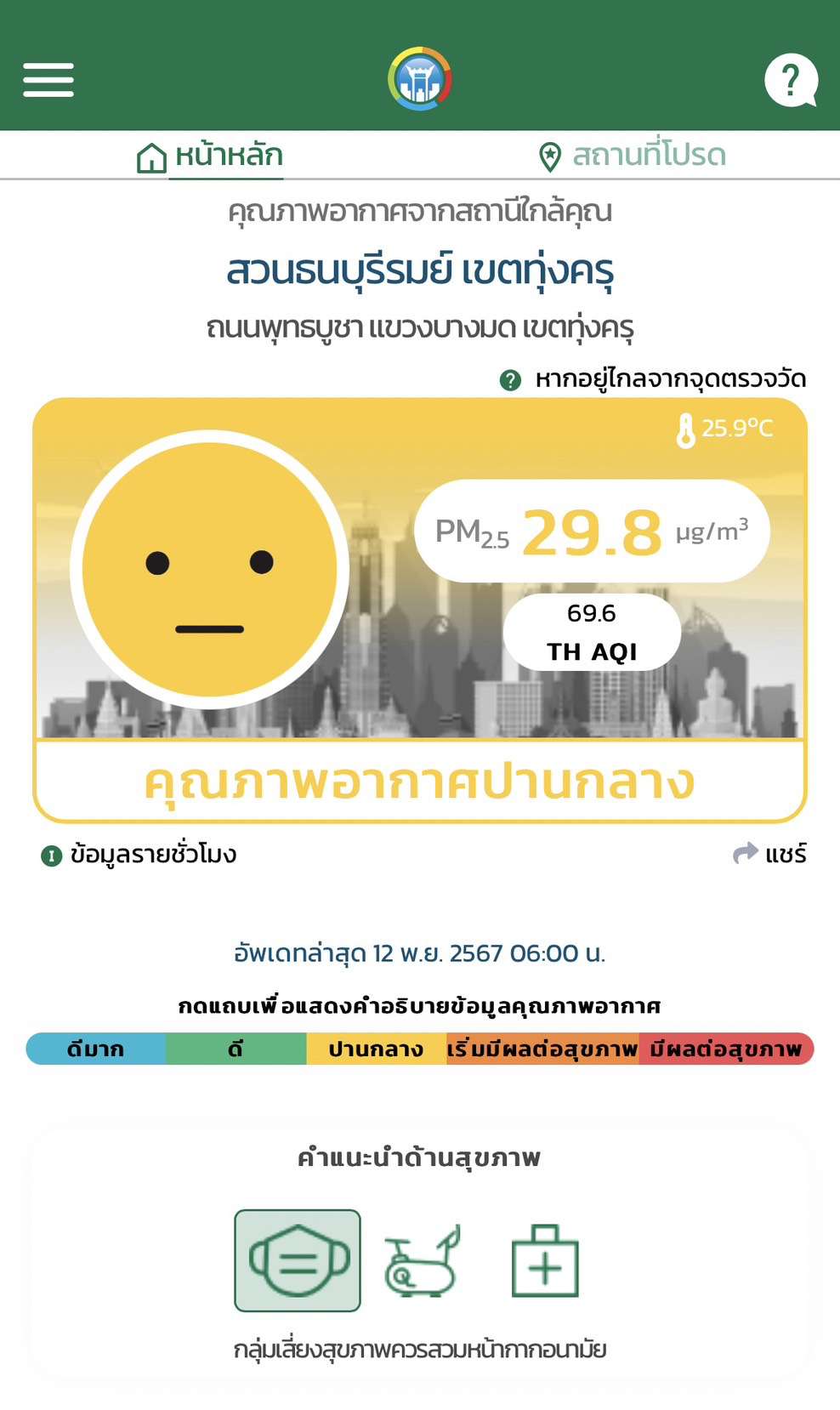 12 พฤศจิกายน 2567 เวลา 07.00 น. ระดับคุณภาพ AQI = 69.6 ระดับค่าฝุ่น PM2.5 = 29.8 ระดับคุณภาพอากาศปานกลาง